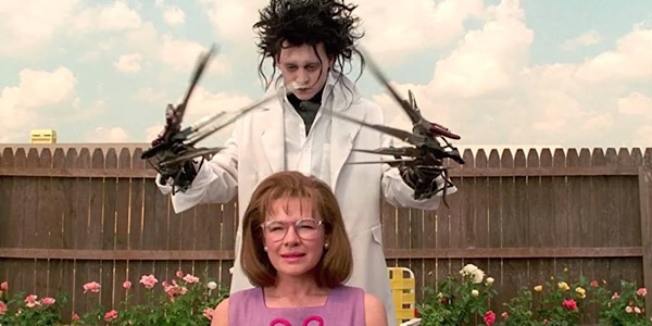 Winona Ryder is the only one who truly sees Edward and their connection, while short lived, is a tender one. Johnny Depp has a gentle demeanor as the titular Edward. Part trepidation, part curiosity, and part a fish out of water, his introduction into the world mirrors our own, and makes him relatable and empathetic.